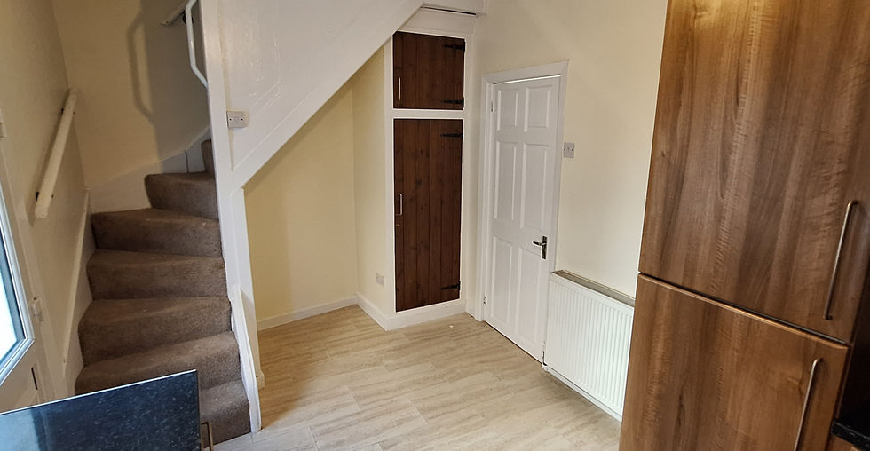 Range of base and wall units, integrated fridge-freezer, built under oven, electric hob. Wood effect flooring, window and half-glazed door to rear. Built in storage cupboard.